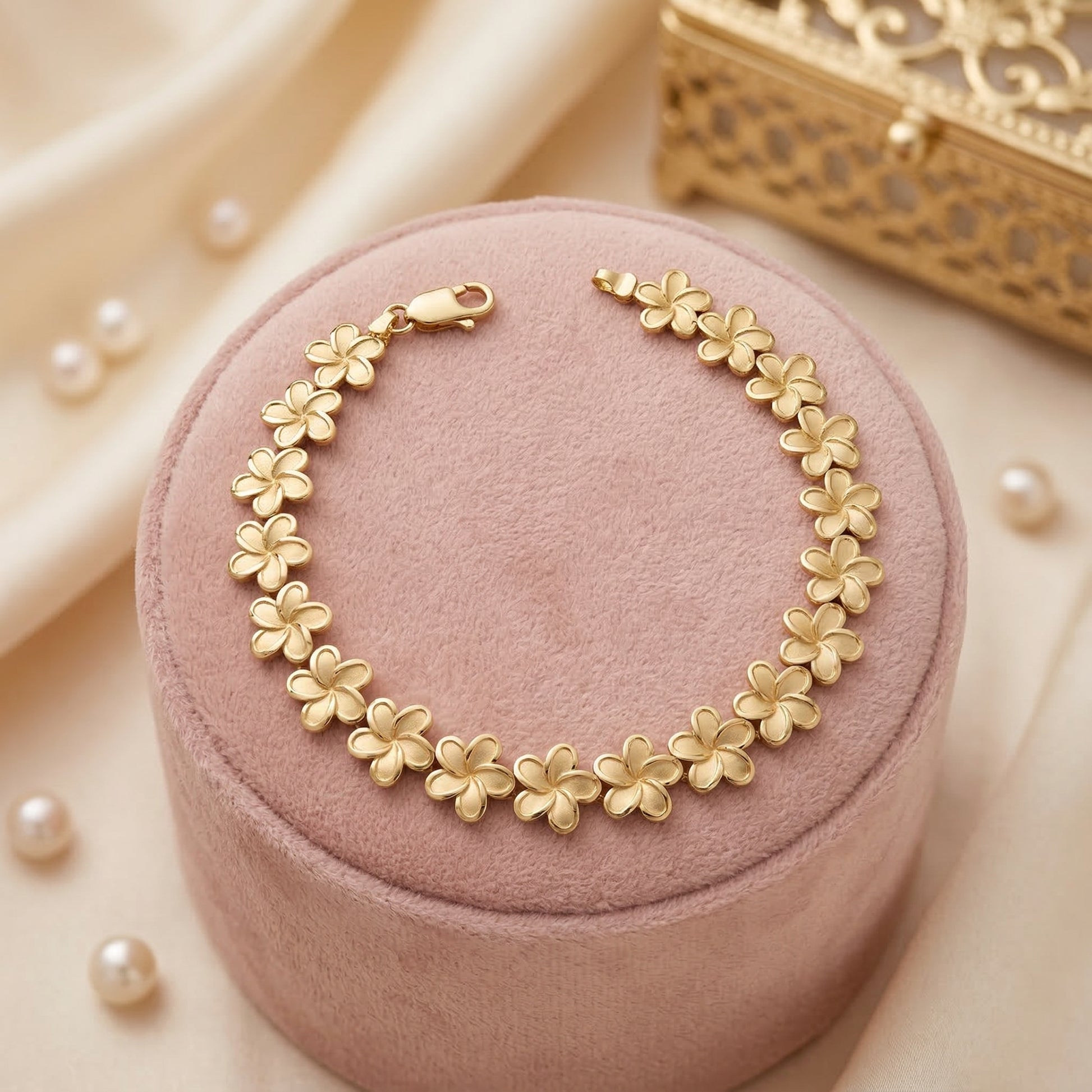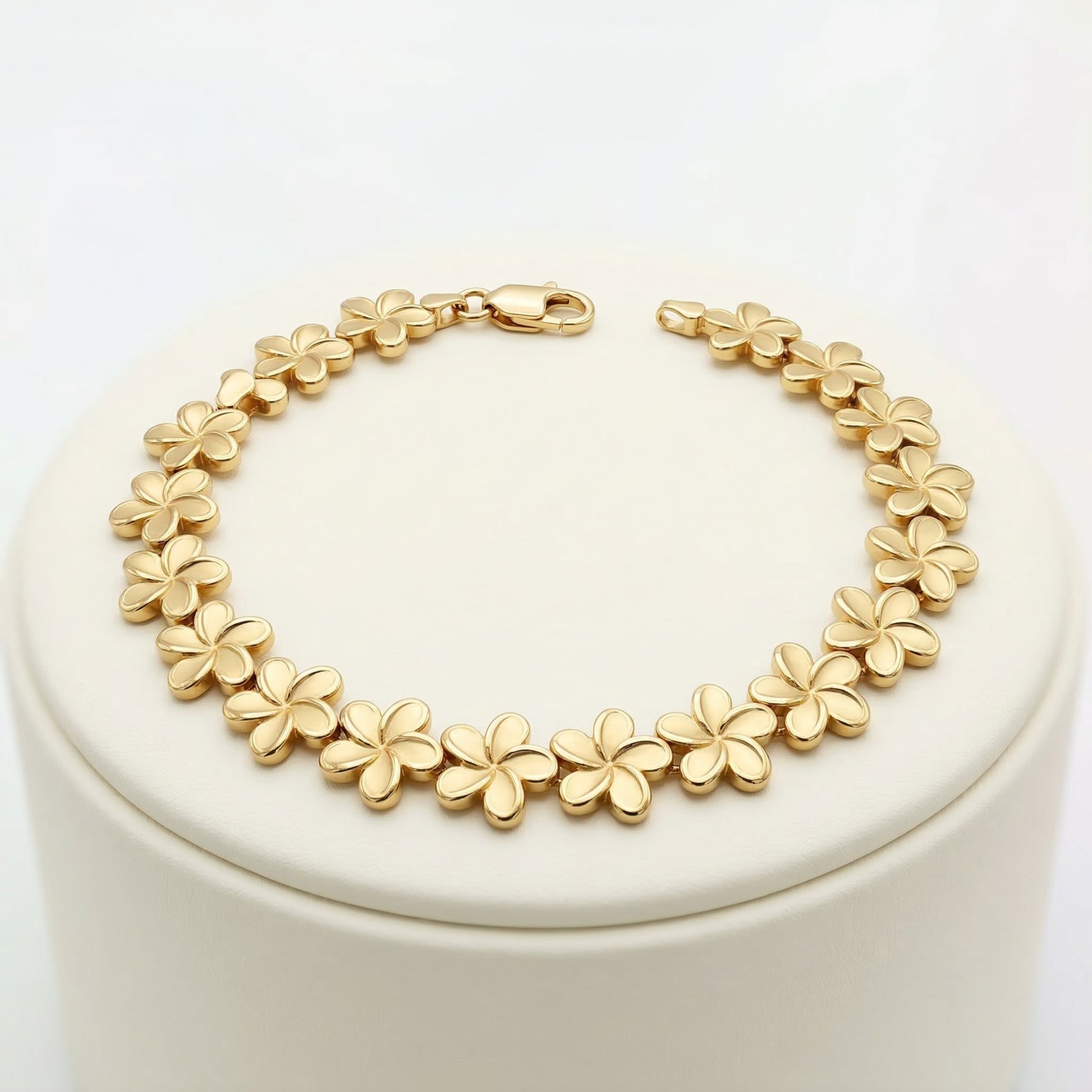 Imagina el brillo cálido del oro de 14k acariciando tu piel mientras cada flor de plumeria refleja la luz con un acabado pulido espejo. Esta no es una simple pulsera, es una obra de arte portátil que transforma cualquier atuendo en una declaración de sofisticación y buen gusto. El diseño continuo de flores entrelazadas crea un efecto visual hipnotizante que captura todas las miradas.